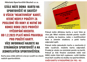 Vážení zákazníci, od 1. 2. 2023 - dochází ke změnám v obchodních podmínkách pro použití skutečských karet pro vstup na sportoviště.